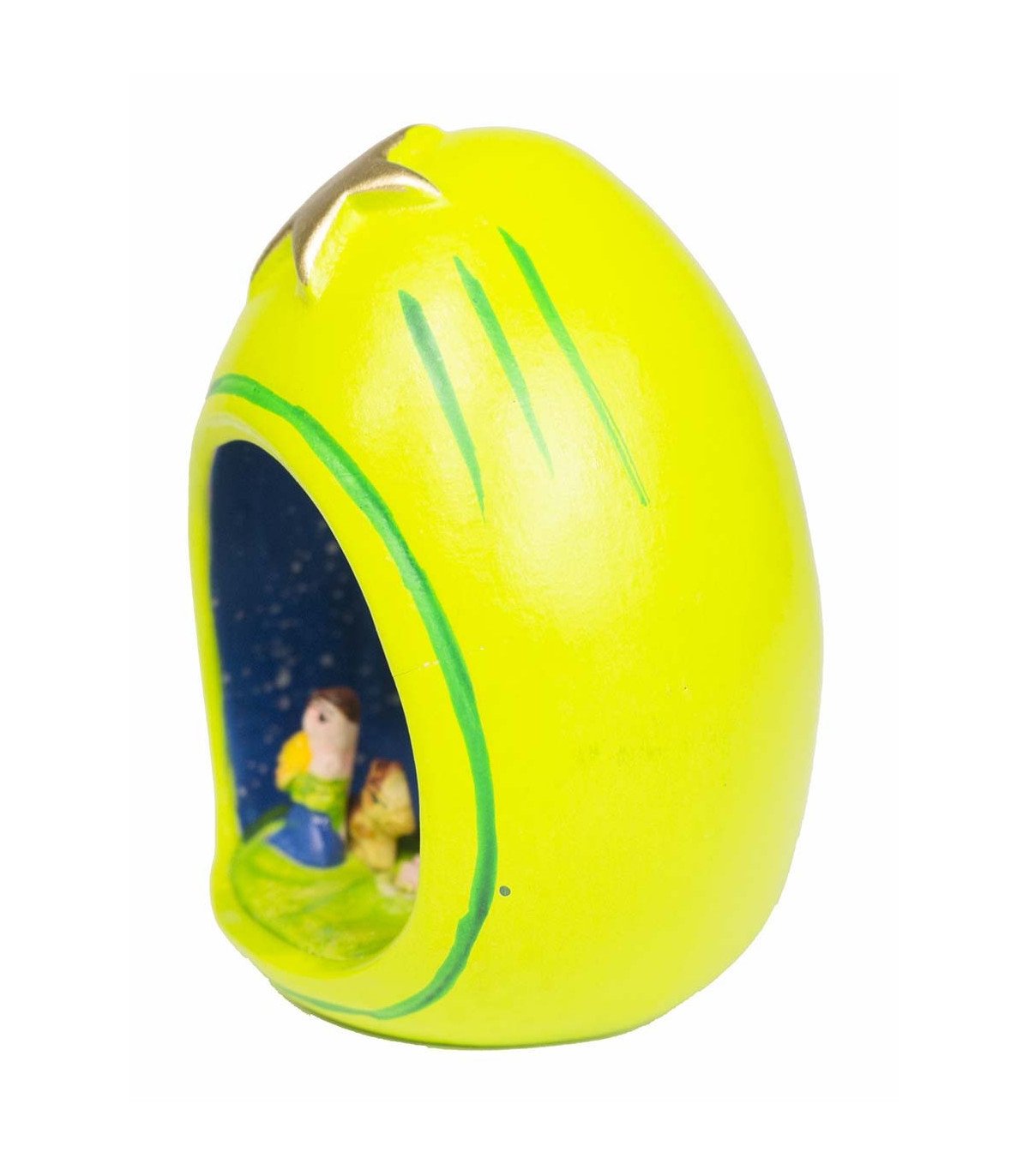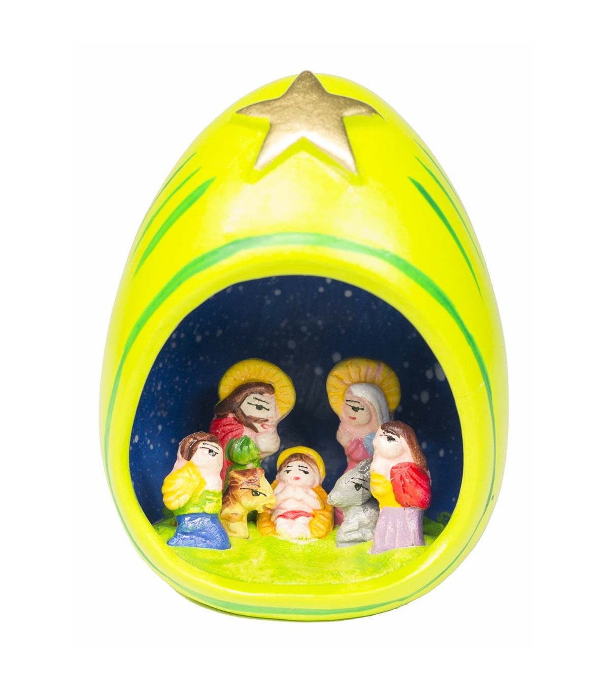 Crèche en terre cuite peinte à la main, 7 figurines. Les personnages se rapprochent de la crèche traditionnelle. Largeur : 6cm. Hauteur : 8cm.