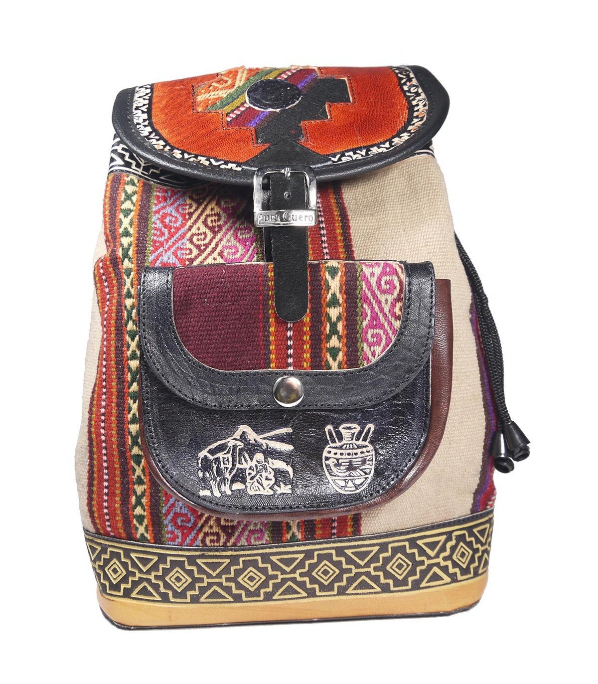 Sac à dos MM tissage serré en laine (manta) étoffe utilisée par les femmes dans le haut plateau péruvien ; poche et rabat en cuir de mouton, doublure intérieure polyester. Fermeture à lacet et rabat à sangle. Dimensions : hauteur 30 cm, largeur 29 cm. Fait main par l’artisan Daniel Condori dans la ville de Cusco.