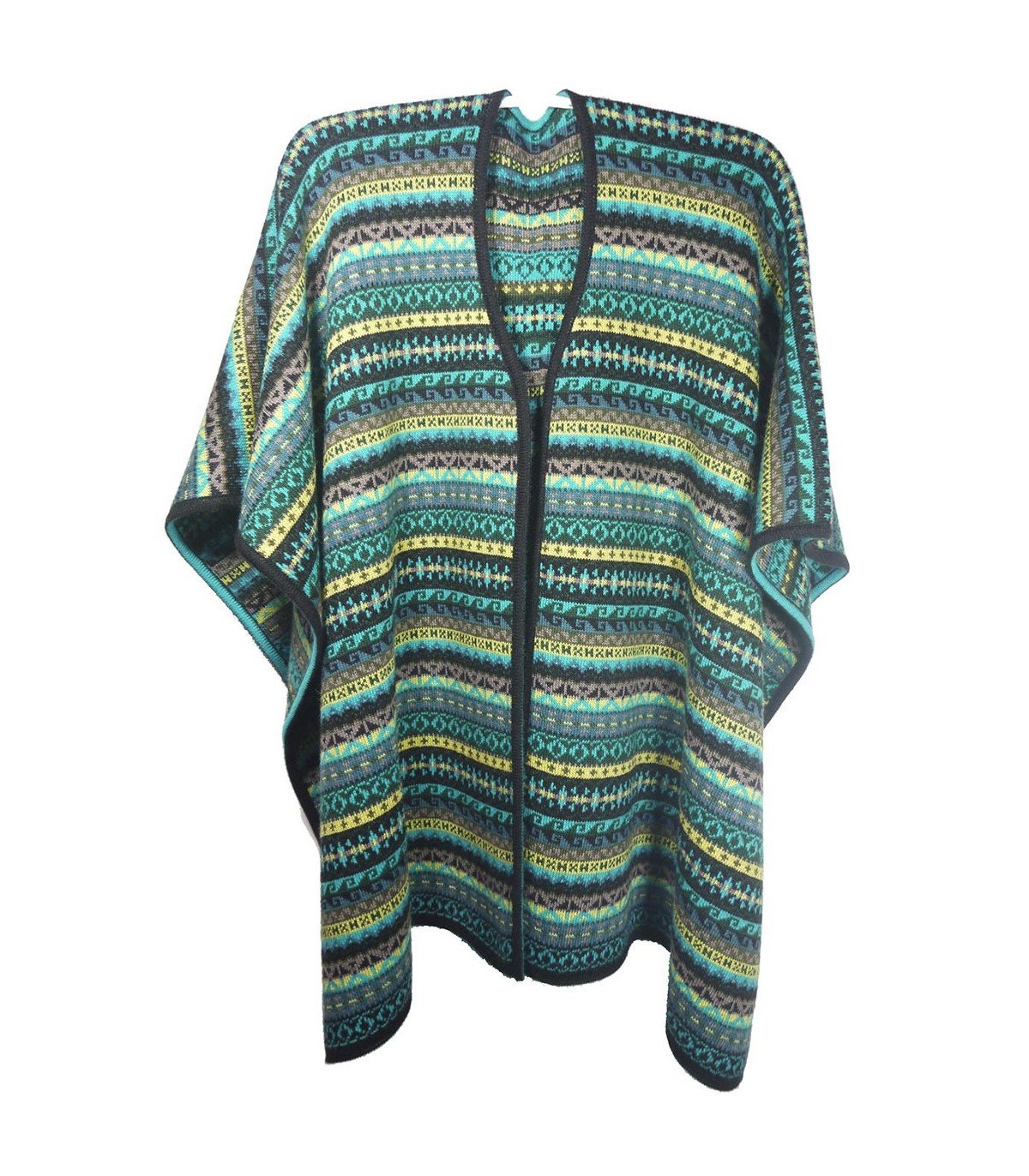 Cape réversible jacquard tricotée en laine d’alpaga (40%) et viscose (60%) par des artisans péruviens ; en maille fine et douce, multicolore à dominante (marron, gris, etc). Chaude, confortable et pratique à porter. Dimensions : a=96cm ; b=72cm