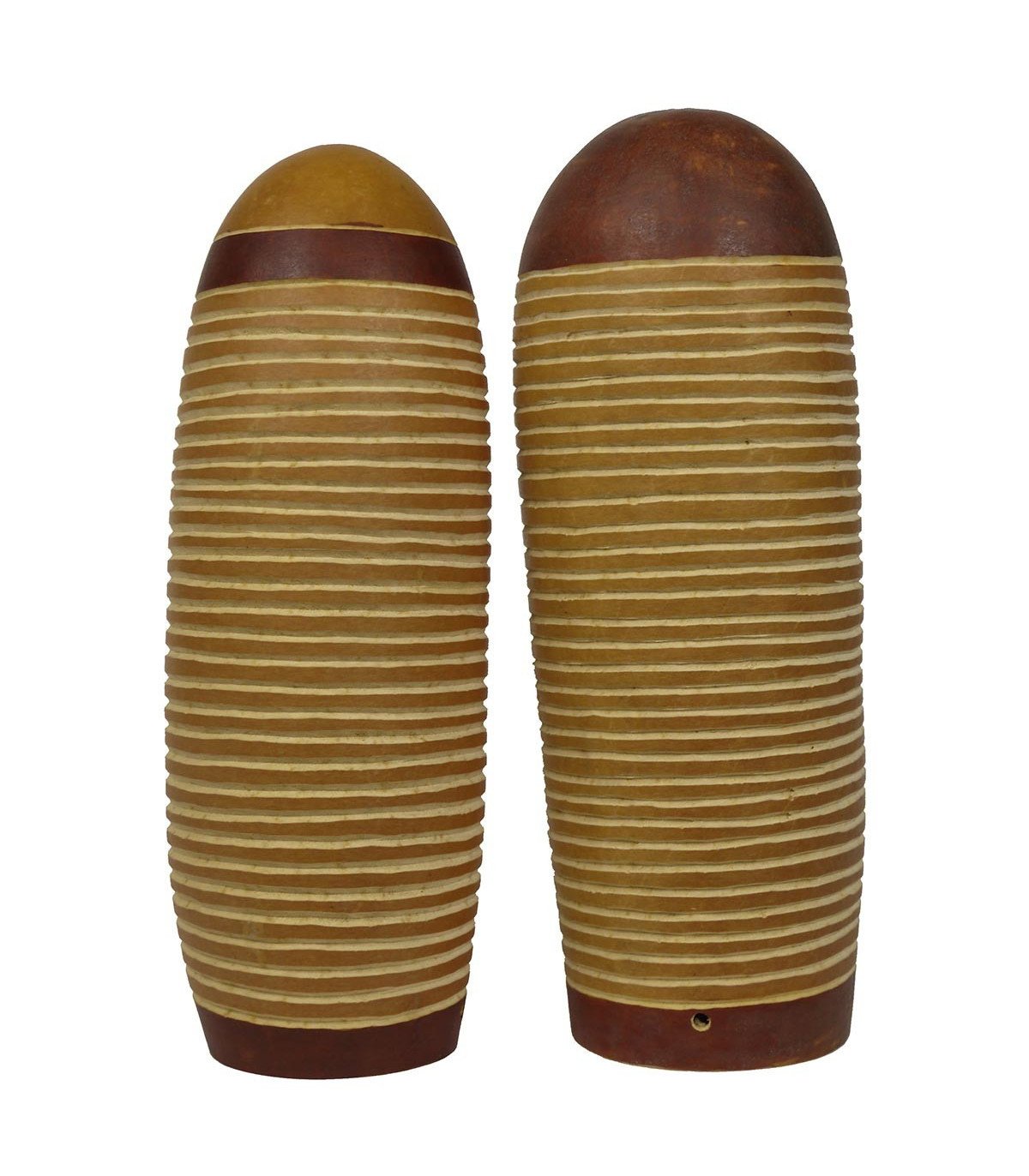 Instrument de percussion fabriqué à la main à partir de calebasse, l'espacement des rainures permet d'obtenir un son sec. Mesures : 23 cm de longueur x 6 cm de diamètre / 24 cm x 7 cm.