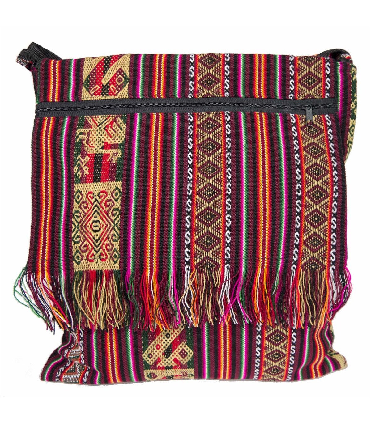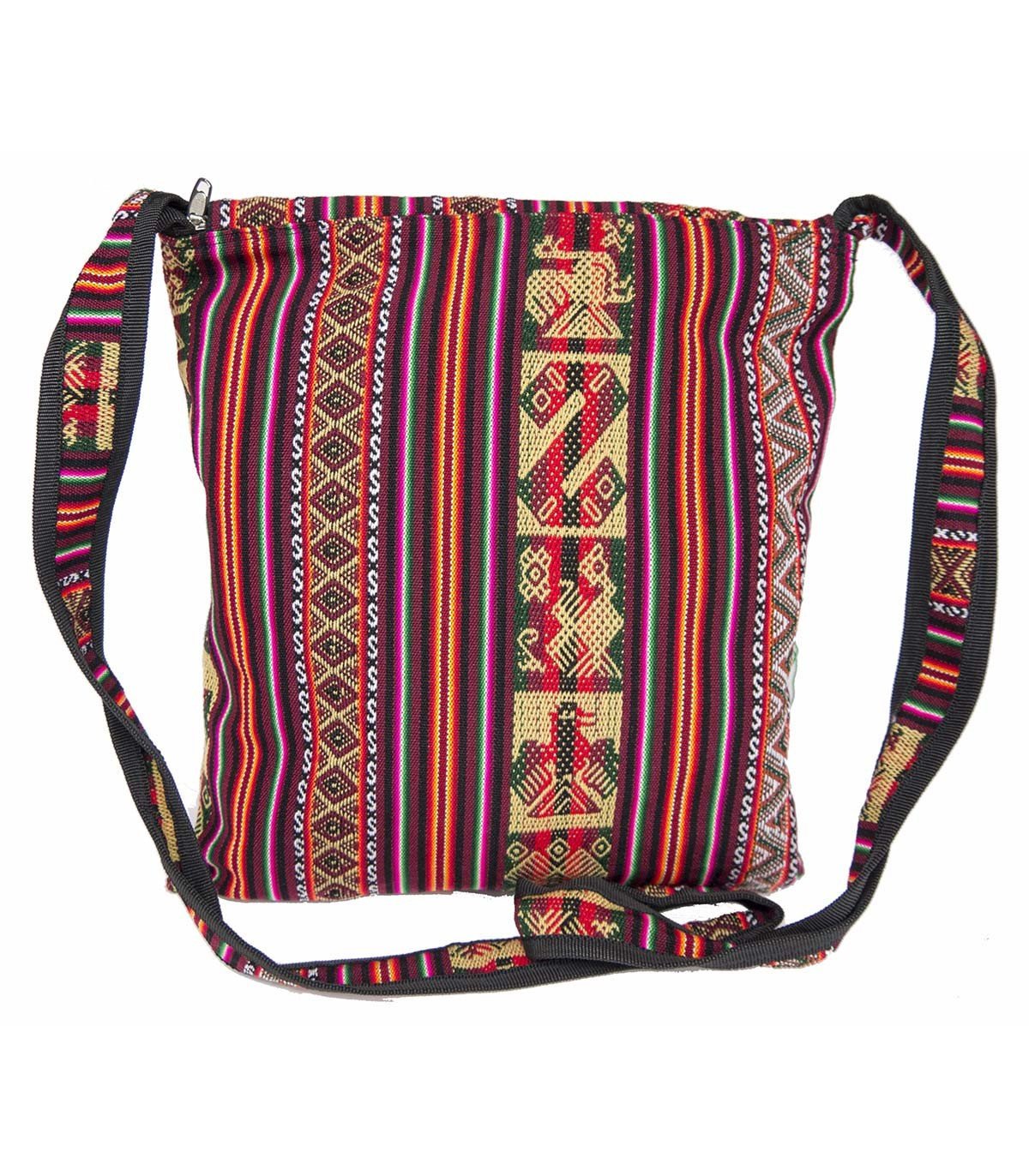 Sac à bandoulière à fermeture principale à zip typique, utilisé par les porteurs de courrier Inca « Chaski », à large rabat zippé transformé en poche. Tissage résistant, reproduction « Manta », doublé de tissu polyester à l’intérieur.  Largeur : 31cm, hauteur : 35cm. Fait main.